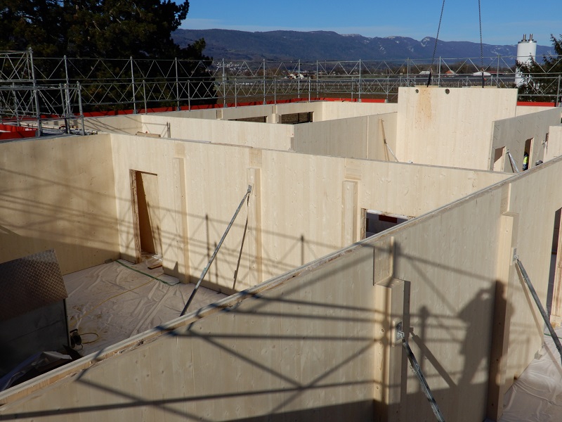 Der Rohbau des Schulraumprovisoriums in Studen ist abgeschlossen. Trotz widrigem Wetter in der Anfangsphase konnte die Konstruktion des Gebäudes in Brettsperrholzbauweise fertig gestellt und das Dach abgedichtet werden. Nun geht es an den Innenausbau und die Montage der Fassade.