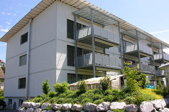 Ein frühes Beispiel für Minergie-Bauweise wurde 2005 in Worb erstellt. Ein dreigeschossiges Acht-Familien-Haus in Holzrahmenbauweise mit einem Treppenhauskern in Stahlbeton. Die Wohnungen im Parterre haben einen Gartensitzplatz und die oberen Wohnungen sind mit einem Balkon aus einer vorgestellten Stahlkonstruktion ausgestattet.