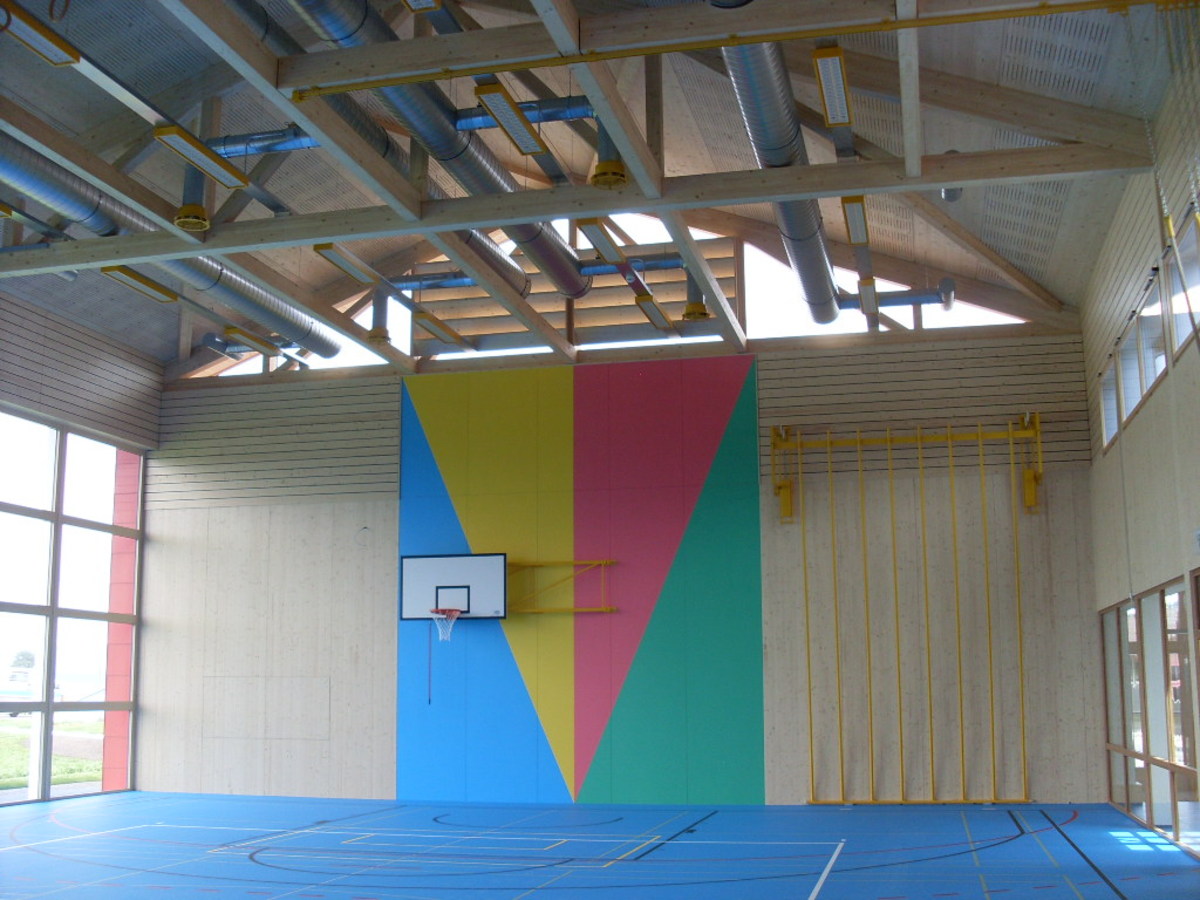 Abgestimmt auf das von Holz geprägte innere und äussere Erscheinungsbild der Halle, wurden deren Tragstruktur und Teile der Aussteifung in Holzbauweise ausgeführt. Besonders ins Auge stechen die Verglasung der Giebelseite, welche den Blick von aussen auf den Fachwerkbinder zulassen und die grosszügigen Fenster auf der Nord-Westseite, die einen starken natürlichen Lichteinfall gewährleisten. Durch die intelligente Wahl der Schalenelemente beim Dach konnten die wichtigsten Funktionen der Gebäudehülle wie die der Bauphysik, Akustik und der Statik elegant kombiniert werden. Das Resultat ist eine hochqualitative Halle in Minergiestandard, welche sich nahtlos ins Dorfbild eingliedert.