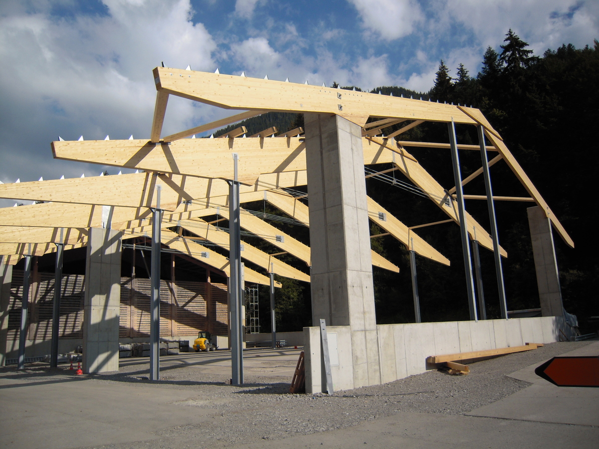 Für die Umsetzung wurde auf eine Mischung aus Beton- und Stahlstützen mit einem Satteldach aus BSH-Sonderträgern gesetzt. Hierbei wurden die Betonstützen zur Aussteifung eingespannt, um zwischen den Rasterabständen keine störenden Spannseile oder Riegel zu verbauen. Um die Schütthöhe so gross wie möglich zu halten, wurden die Zugstäbe besonders hoch eingebaut und mittels spezieller Stahlplatten an den Trägern befestigt.
