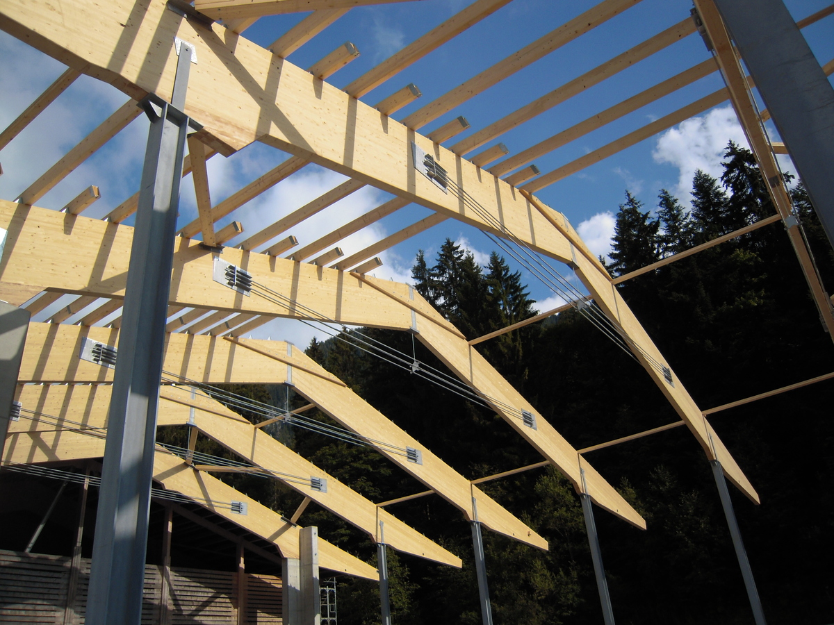 Für die Umsetzung wurde auf eine Mischung aus Beton- und Stahlstützen mit einem Satteldach aus BSH-Sonderträgern gesetzt. Hierbei wurden die Betonstützen zur Aussteifung eingespannt, um zwischen den Rasterabständen keine störenden Spannseile oder Riegel zu verbauen. Um die Schütthöhe so gross wie möglich zu halten, wurden die Zugstäbe besonders hoch eingebaut und mittels spezieller Stahlplatten an den Trägern befestigt.