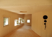Beide Teile haben eine Fassade aus vertikaler, vorvergrauter Tannenschalung erhalten, die als verbindendes Element wirkt. Im Neubau bietet eine Galerie mit Spiel- und Kuschelecke Rückzugsmöglichkeiten für die Kinder. Die Oberflächen sind dort von weiss lasierten Dreischichtplatten, geöltem Eichenparkett, hellgrauen Fenstern und Türen sowie hellen Einbaumöbeln bestimmt. Die Galerie wurde in Brettsperrholzbauweise ausgeführt. Besonderes Augenmerk musste hier auf die Emissionen der Verleimung und Materialwahl der verwendeten Baustoffe gelegt werden.