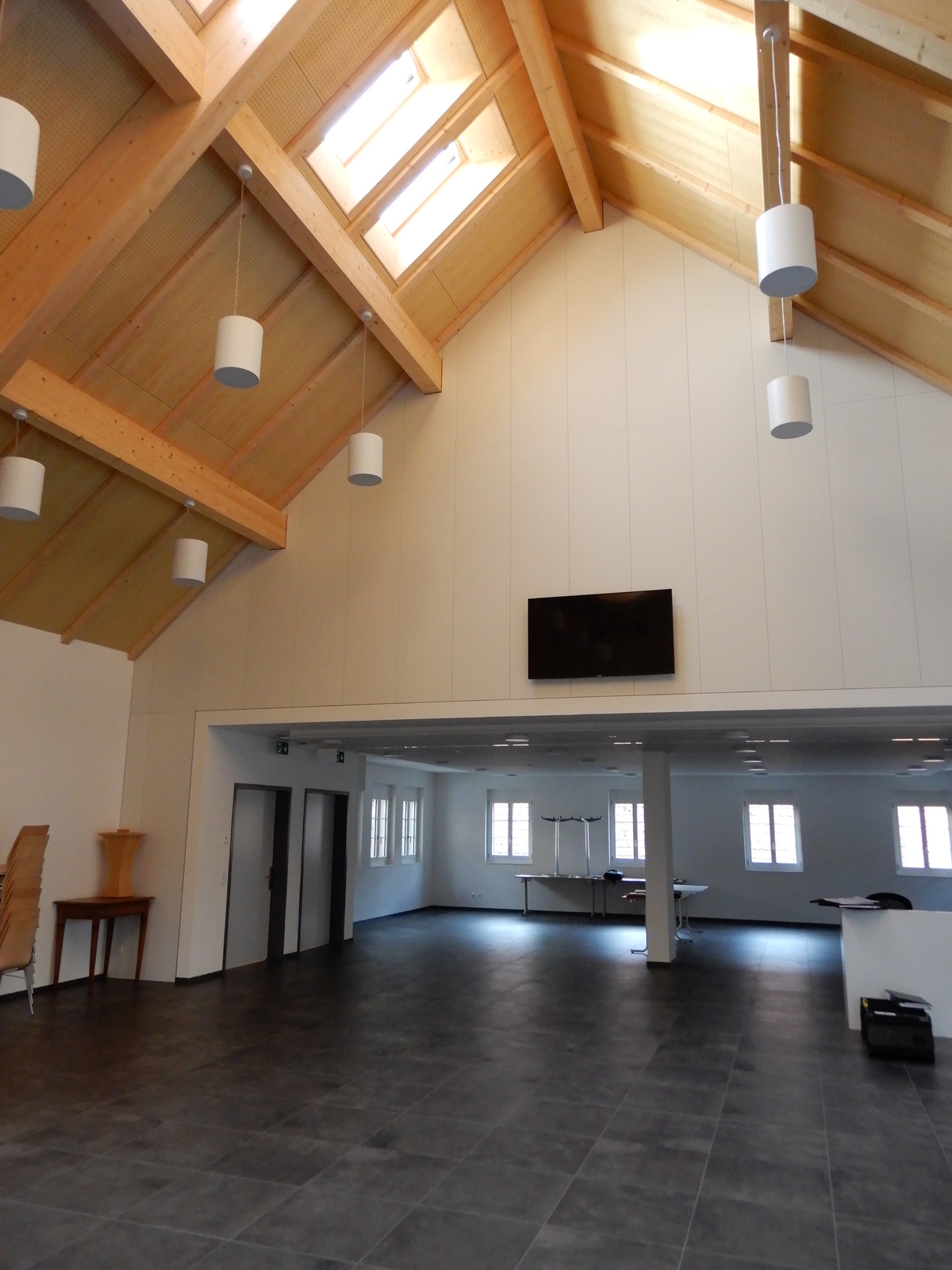 Besondere Aufmerksamkeit galt der Akustik der grossen Sääle. Dazu wurden zwischen den Feldern der sichtbaren Sparren Akustikpaneele montiert und grosse Teile der Saalwände verkleidet.